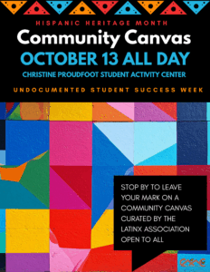 Stop by to leave your mark on a community canvas curated by the Latinx Association. Open to all.